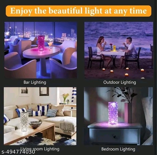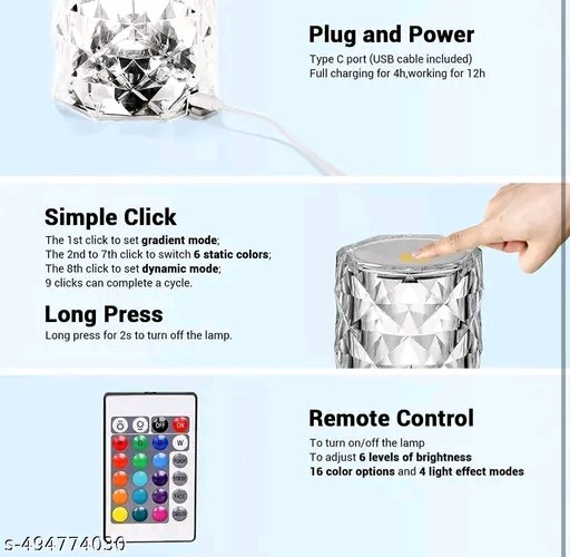 Crystal LED Touch Table Lamp with Remote Control – USB Powered 3D Diamond Cut Multicolor Night Light for Home Décor, Bedroom, and Gift Use Description:- Add a dazzling touch to your interiors with this Crystal LED Touch Table Lamp featuring a mesmerizing 3D diamond-cut design. This elegant lamp produces brilliant color effects and reflective light patterns, creating a soothing and luxurious atmosphere. Powered by USB (not battery-operated), this non-rechargeable lamp ensures stable and continuous lighting—ideal for extended use. With both touch functionality and a remote control, you can easily adjust the color and brightness settings to match your mood or space. Key Features:- Non-Rechargeable – USB Powered: Continuous lighting via USB power connection (adapter or power bank) 3D Crystal-Cut Surface: Reflects stunning prism-like patterns on surfaces Multiple Light Effects: Static, flash, fade, and smooth transitions Touch + Remote Control: Convenient operation from your bedside or acr